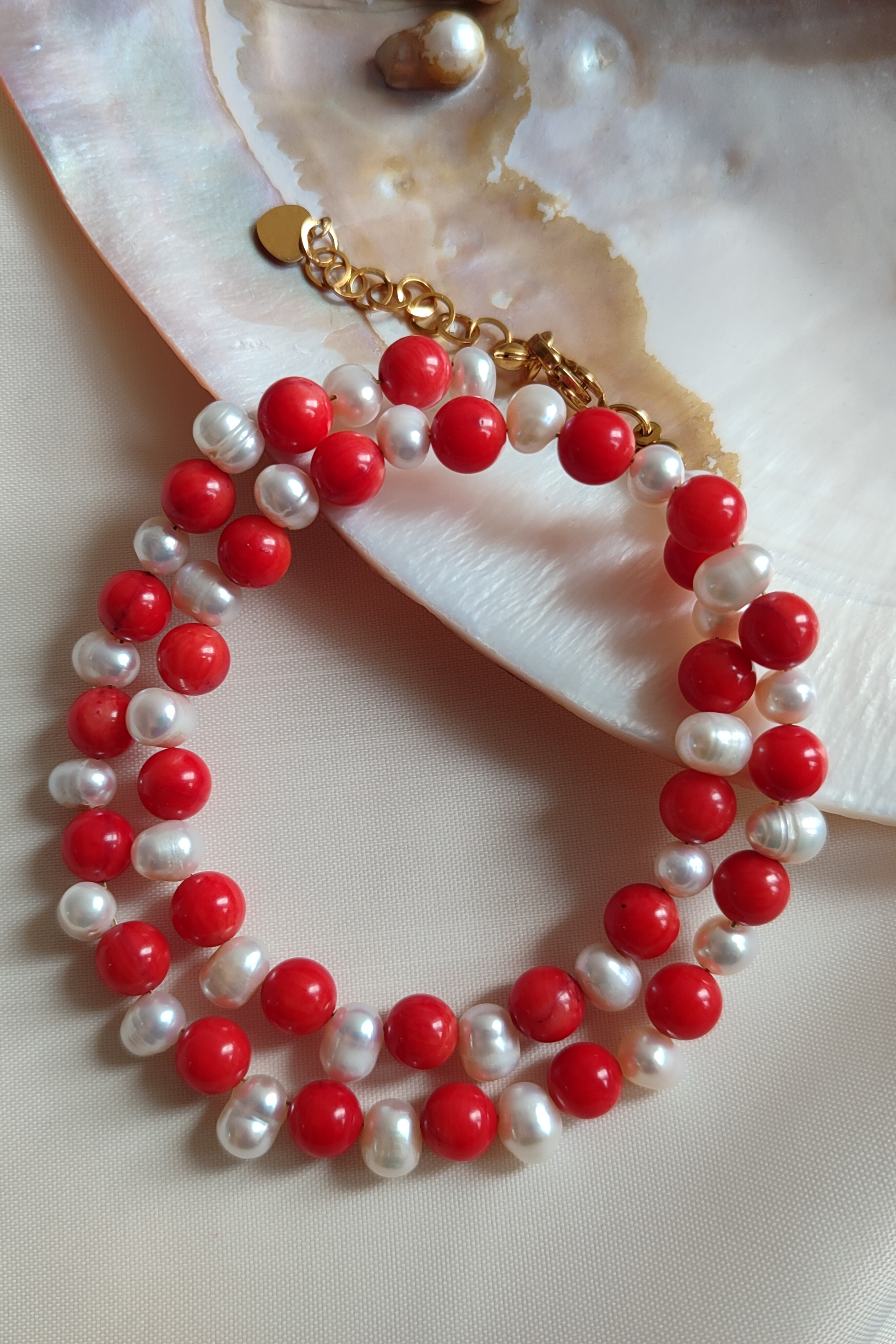 گردنبند مروارید پرورشی و سنگ مرجان با قفل و اتصالات استیل طلایی