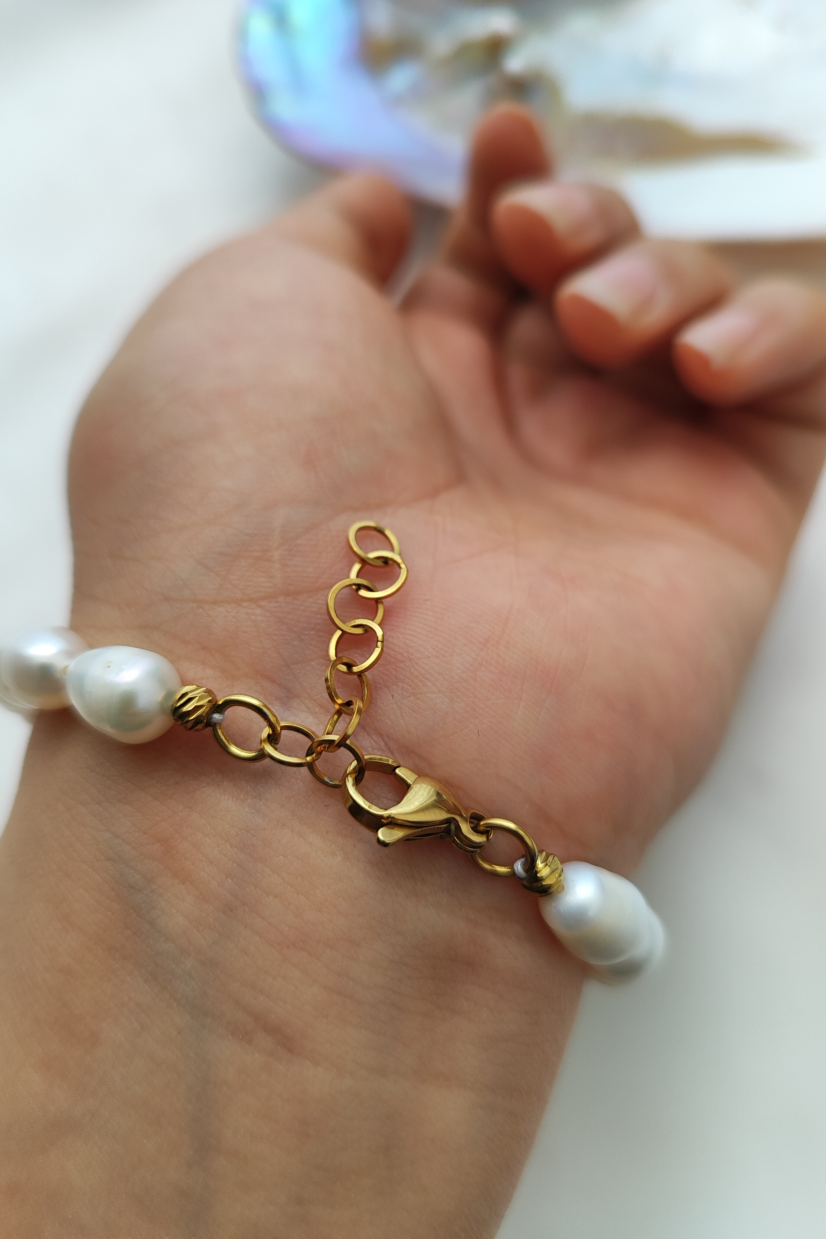 این دستبند جذاب، ترکیبی از مروارید پرورشی گندمی سفید سایز ۱۰ میل و اتصالات استیل رنگ ثابت است که آن را به انتخابی ماندگار و شیک برای استایل روزمره و مجلسی تبدیل میکند.