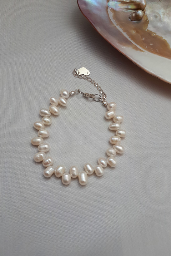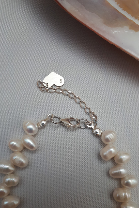 این دستبند زیبا از مروارید پرورشی اصل با گرید AAAبه صورت چپ و راستی ساخته شده است.اتصالات و قفل نقره 925عیار در کنار مروارید طبیعی زیبایی خاصی به این دستبند داده.سایز مروارید ها 6میلی متر و رنگ آنها سفید میباشد همچنین این دستبند زنجیر تنظیم سایز دارد که برای همه سایز ها مناسب می باشد.
