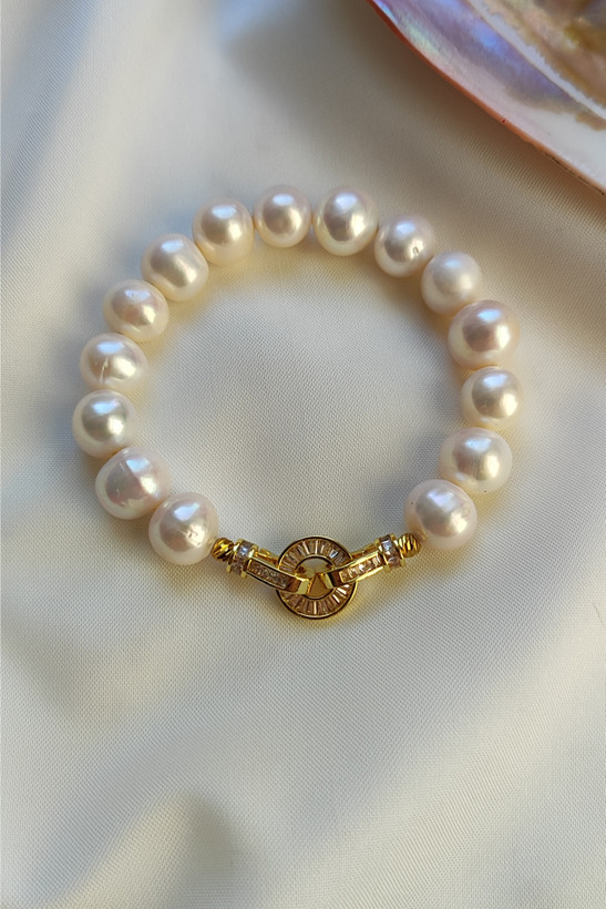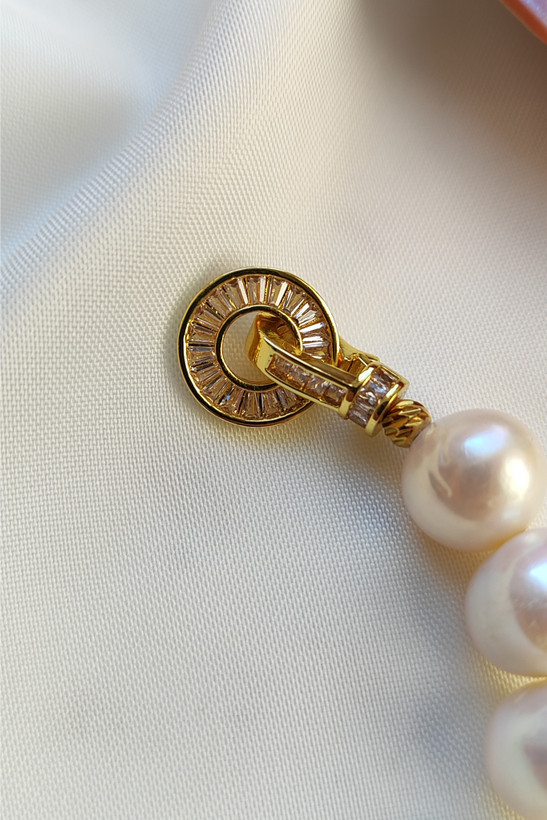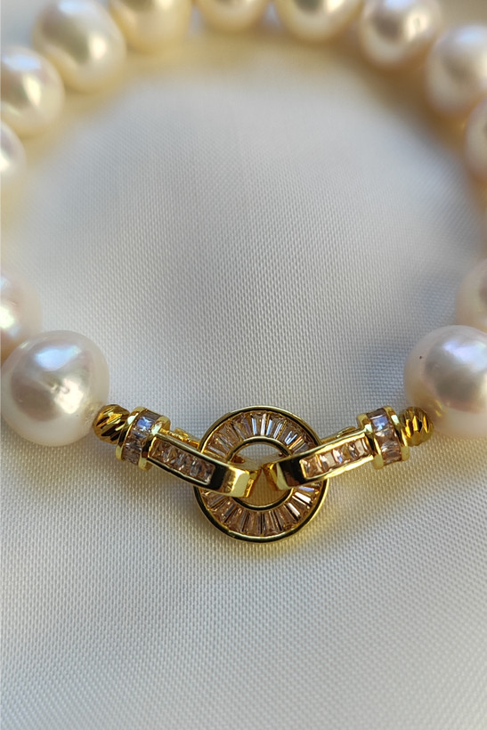 این دستبند زیبا از مروارید پرورشی گرد سایز 12میلی متر با قفل و اتصالات سوارسکی وارداتی با کیفیت رنگ ثابت و ضد حساسیت که زیبایی آن را دو چندان کرده ساخته شده است .