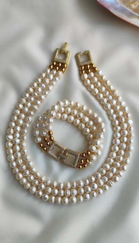 ست گردنبند و دستبند مروارید پرورشی سهردیفه با قفل سوارسکی وارداتی