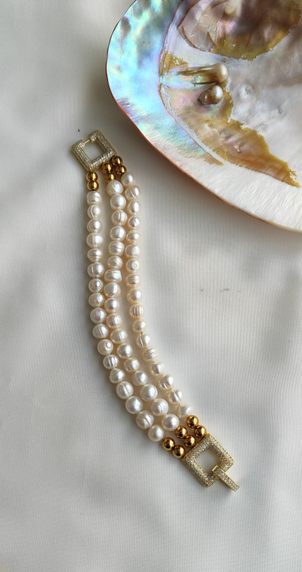 مرواریدهای بهکاررفته در این محصول از نوع مروارید پرورشی آب شیرین هستند که به دلیل فرآیند رشد طبیعی در صدف، دارای درخشندگی (Luster) بالا، سطح براق و طیف رنگی سفید شیری با هالههای طبیعی صدفی میباشند. هر مروارید بافت و فرم منحصربهفرد خود را دارد که نشاندهنده اصالت آن است و همین ویژگی، زیبایی کار را دوچندان میکند.