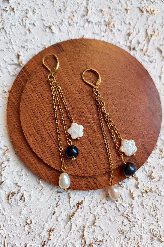 اگر به دنبال ترکیبی خاص از ظرافت و اصالت هستید، این گوشواره آویزی با طراحی نامتقارن و ترکیب مروارید پرورشی سفید، مروارید پرورشی سرمه ای ومروارید باروک شکوفه بهترین انتخاب برای شماست.